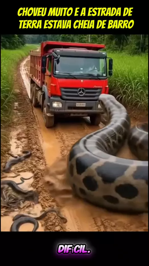 Choveu muito e a estrada de terra estava cheia de barro, tornando a passagem difícil. Um caminhão vinha trafegando quando de repente se deparou com uma sucuri #fy #foryou #ia #viraliza #vidaanimal