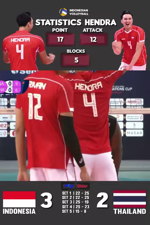 Statistics Hendra Point : 17 Attack : 12 Blocks : 5 Sc : @vidiosports @Moji Sports#volleyball#PBVSI#timnasional#timnasvoliindonesia#voliindoor#indonesianvolleyball#voliasik#voli#volitarkam#voliindo#FIVB#VolleyballWorld#Volleyball#SeaVLeague#AVCNationCup#AVC#AVCVolley#AsianVolleyball