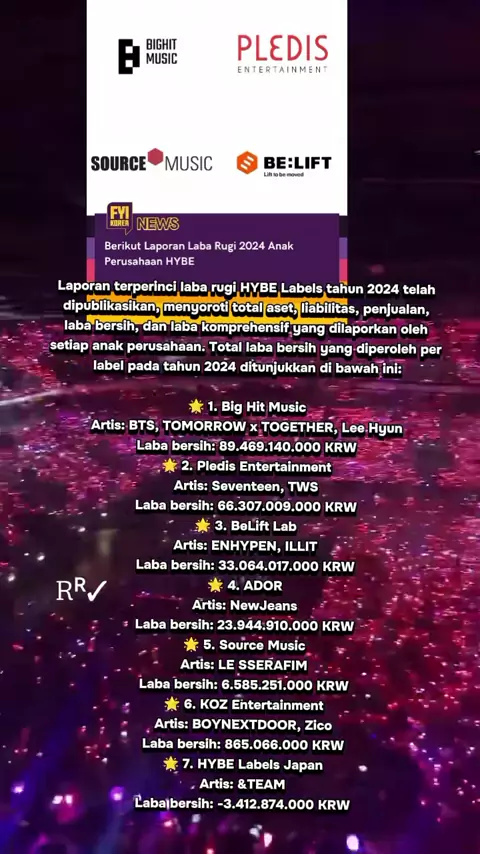 Laporan terperinci laba rugi HYBE Labels tahun 2024 telah dipublikasikan, menyoroti total aset, liabilitas, penjualan, laba bersih, dan laba komprehensif yang dilaporkan oleh setiap anak perusahaan. Total laba bersih yang diperoleh per label pada tahun 2024 ditunjukkan di bawah ini: 1. Big Hit Music Artis: BTS, TOMORROW x TOGETHER, Lee Hyun Laba bersih: 89.469.140.000 KRW 2. Pledis Entertainment Artis: Seventeen, TWS Laba bersih: 66.307.009.000 KRW 3. BeLift Lab Artis: ENHYPEN, ILLIT Laba bersi...