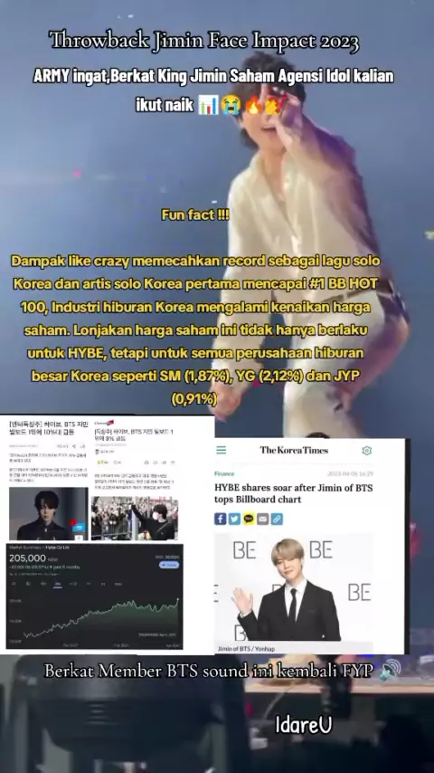 Gara2 Jimin soundnya kembali ππ₯π Impact Member BTS emang gak ada obat π€§ Fun fact !!! Dampak like crazy memecahkan record sebagai lagu solo Korea dan artis solo Korea pertama mencapai#1 BB HOT 100, Industri hiburan Korea mengalami kenaikan harga saham. Lonjakan harga saham ini tidak hanya berlaku untuk HYBE, tetapi untuk semua perusahaan hiburan besar Korea seperti SM (1,87%), YG (2,12%) dan JYP (0,91%)#1YearWithLikeCrazy#μ§λ―Ό_LikeCrazy_1μ£Όλ