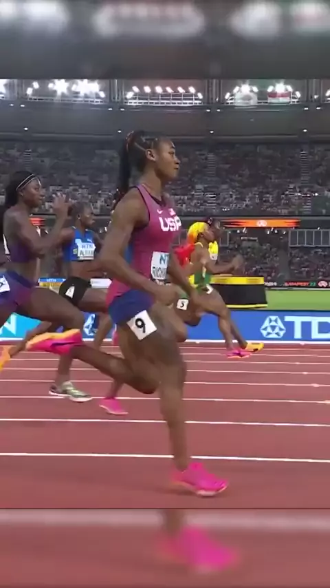 Final dos 100m feminino no campeonato mundial de atletismo em Budapest 2023.