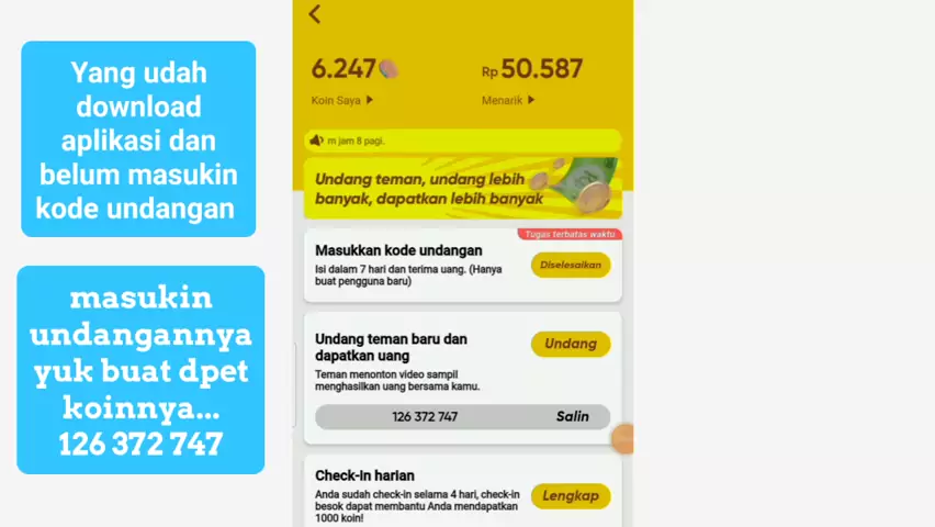 126 372 747 masukin kode undangan aku ya, buat dapet koin banyak #carapencairan #snackvideo