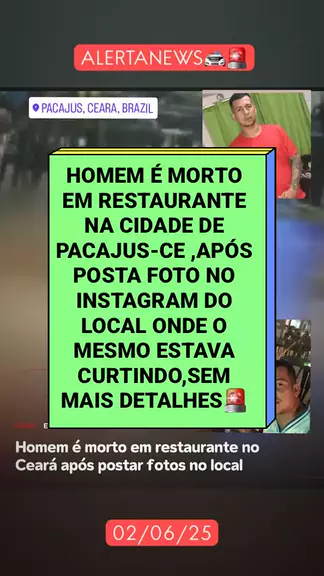 HOMEM É MORTO EM RESTAURANTE NA CIDADE DE PACAJUS-CE ,APÓS POSTA FOTO NO INSTAGRAM DO LOCAL ONDE O MESMO ESTAVA CURTINDO,SEM MAIS DETALHES🚨 #noticiasdeultimahora #últimasnotícias #ceara3xmaisforte #ultranotícia #homicídio More