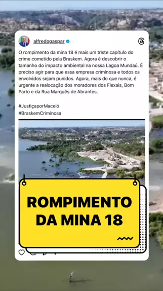 O rompimento da mina 18 é mais um triste capítulo do crime cometido pela Braskem. Agora é descobrir o tamanho do impacto ambiental na nossa Lagoa Mundaú. É preciso agir para que essa empresa criminosa e todos os envolvidos sejam punidos. Agora, mais do que nunca, é urgente a realocação dos moradores dos Flexais, Bom Parto e da Rua Marquês de Abrantes. #JustiçaporMaceió #BraskemCriminosa