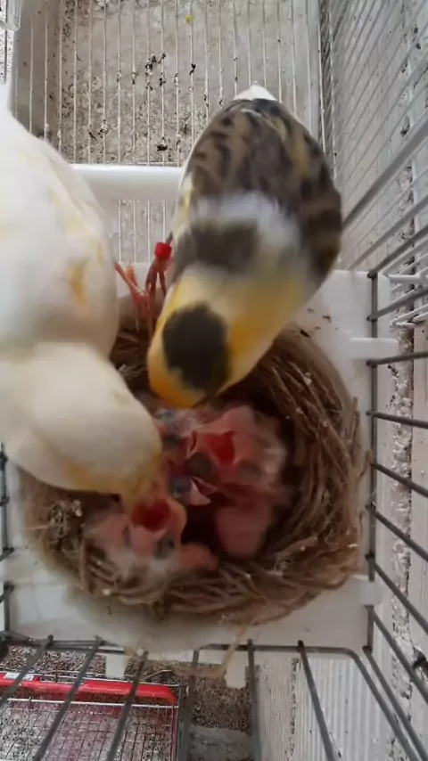 Casal de canários belgas alimentando os filhotes #amigosdepenas