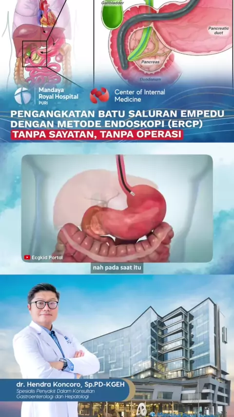 Metode ERCP (Endoscopic Retrograde Cholangiopancreatography) digunakan untuk mengeluarkan batu dari saluran empedu. Prosedur ini menggunakan alat endoskopi yang masuk melalui mulut, kerongkongan, lambung, hingga usus dua belas jari diikuti dengan penggunaan guide wire dan balon ekstraktor untuk mengeluarkan batu dari saluran empedu. Dibandingkan prosedur bedah, Metode ERCP sangat minim risiko terjadinya komplikasi karena tidak ada luka sayatan atau dilakukannya pembedahan Booking Appointment: ...