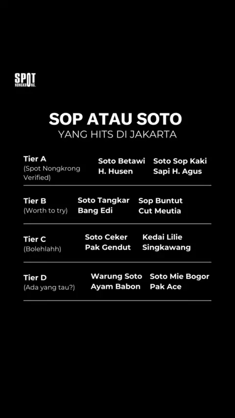Ranking untuk soto atau sop yang di cap hits di Jakarta versi spot nongkrong udah keluar nih! Kalian setuju sama tier ini??? Atau ada rekomendasi lain yang harus dicoba?πβ¨#spotnongkrong#restaurantjakarta#restobarjakarta#kulinerjakpus#kulinerjakarta#kulinerjaksel#tempatnongkrongjakarta#dateideas#tempatwfcjakarta#cafejakartaselatan#viral#jktupdate#placetogojkt#whattoeatjakarta