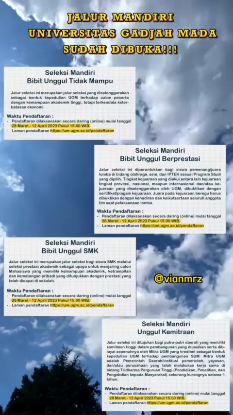 ib : @MASUK PTN UTBK SNBT SNBP 2023 Hallo SOTEN (SObat PTN) masih kecewa yaa dengan hasil SNBP? it's okey itu wajar kok... daripada meratapi SNBP MinSOT ada info nih JALUR MANDIRI UGM SUDAH DIBUKA LOHH... YUKK BURUAN DAFTAR dan wujudkan impian kalian menjadi GADJAH MADA MUDA 2023...Good luck#snbp#snbp2023#alfnmrz#snbt#snbt2023##mandiri#mandiri2023#utbk#utbk2023#UGM#universitasgadjahmada#pejuangptn#pbutmugm#pbubugm#kemitraan#MinSOT#SObatPTN