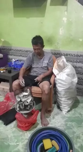Master gaple lagi serius nimbangin batu karang untuk di jual.