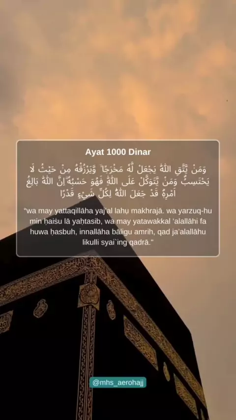Diantara Fadhilah Ayat 1000 Dinar / Surah At-Talaq Ayat 2-3 adalah: 1. Memperoleh kemurahan rezeki yang tidak disangka-sangka. 2. Diberi jalan keluar dari segala masalah dan kesulitan. 3. Mendapat perlindungan dari segala musibah dan bala bencana. 4. Allah akan menunaikan segala hajat dan memberi kemudahan dalam setiap urusan. Baca dengan penuh yakin dan bersungguh-sungguh, hanya Allah tempat kita berserah diri. Insyaallah akan dilancarkan segala hajat kita, Aamiin...🤲🏻 ___ Nikmati Umr...