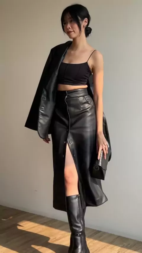 A ticket to a fierce look for day and night🔥 Bi leather oversized blazer & Sidik Jari leather skirt #leatherskirt #leatherblazer #blzridxsb