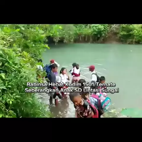 Babinsa Koramil 1501-03/Jailolo Kodim 1501/Ternate Kopda Mario Gino memonitoring sekaligus membantu anak Sekolah Dasar (SD) menyeberangi sungai saat terjadinya banjir, di lokasi wilayah binaan Kodim 1501/Ternate, Desa Todowongi, Kecamatan Jailolo, Kabupaten Halmahera Barat, Rabu (31/01/2024). Untuk diketahui, jarak jalan umum dari desa Todowongi RT. 004 ke Kampung Besar Todowongi kurang lebih berjarak 1.300 Meter. Aktivitas keseharian warga RT 04 selalu melewati jalan pintas yaitu sungai yang b...