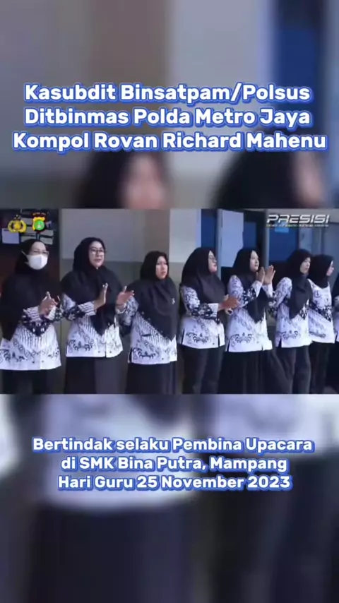 Kasubdit Binsatpam/Polsus Ditbinmas Polda Metro Jaya Kompol Rovan Richard Mahenu, S.I.K, M.S.i Bertindak selaku Pembina Upacara di SMK Bina Putra, Mampang Jakarta Selatan dalam rangka memperingati Hari Guru pada 25 November 2023. Kompol Rovan menyampaikan ucapan selamat Hari Guru ke-78 atas jasa-jasa dan dedikasi guru. Beliau juga berpesan kepada para siswa untuk menuntut ilmu dengan tekun. Para siswa juga diharapkan menjadi agen perubahan. Memasuki tahapan pemilu 2024, para guru dan siswa dih...