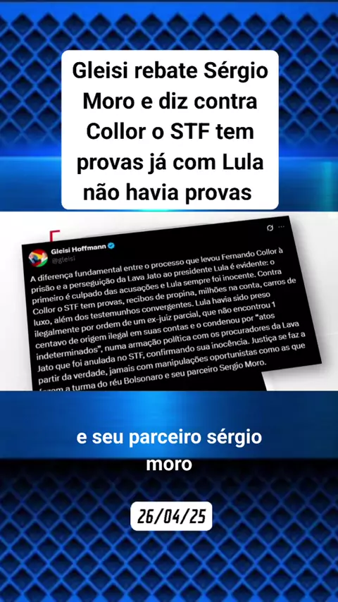 Gleisi rebate Sérgio Moro e diz contra Collor o STF tem provas já com Lula não havia provas #noticias #ultimasnoticias