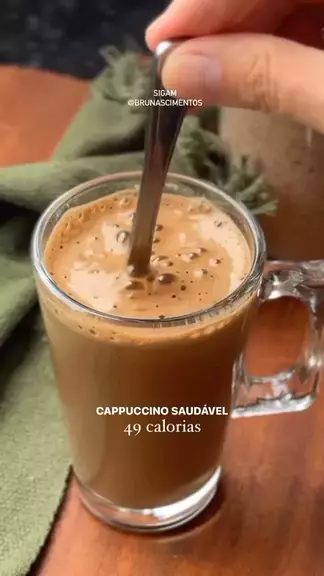 Esse climinha pede um CAPPUCCINO! Esse é saudável e tem apenas 49 calorias. Algumas dicas: * cada colher cheia de cappuccino tem 20g, essa porção tem 49 calorias * ��Pode bater no liquidificador, no mixer ou até passar numa peneira com auxílio do fundo de uma colher. A intenção é desmanchar o café solúvel e deixar tudo homogêneo. * ��se for usar outro adoçante, use o equivalente a 20 colheres de sopa de açúcar. * ��se quiser deixar mais proteico coloque uma colher de whey na hora do preparo.