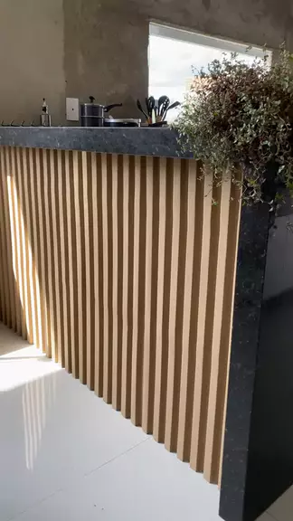 Parede ripada do balcão finalizada. Ficou perfeito. 🏠💖. #balcao #bancada #parederipada #painelripado #ripadodegesso