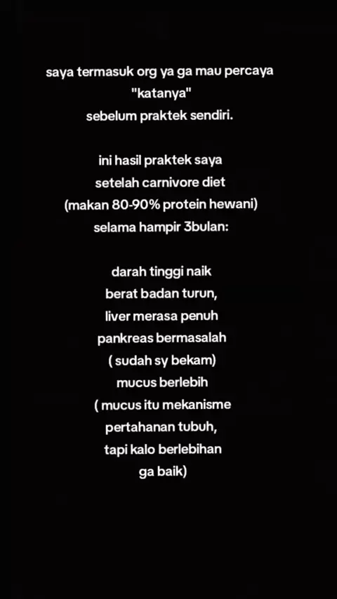 Semoga semua orang yg saya sarankan protein hewani keadaan tubuhnya tetap baik. atau diberi Ilham untuk beralih ke diet seimbang. hanya Karbo mang harus dikurangi karena pemicu inflamasi. terus yang Perlu diperhatikan adalah cara membersihkan dari pestisida sebaiknya pake baking soda dan jeruk nipis. saya sekarang beralih ke diet nya Dr. Sebi less mucus, dengan list" makanan yg sudah diaprove nya.#diet#carnivorediet#drsebi#kesehatan#makanan