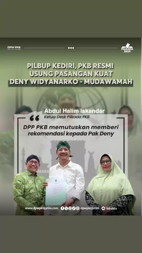 Owner PT Taji Mas Grup Deny Widyanarko telah mengantongi rekomendasi dari Partai Kebangkitan Bangsa (PKB) untuk maju di Pilkada Kabupaten Kediri 2024. Partai berlambang bintang sembilan ini merekomendasikan Deny berpasangan dengan Ketua Muslimat Kabupaten Kediri Mudawamah. #dpwpkbjatim_ #pilbupkediri #pilbupkediri2024 #pkbkediri #dpcpkbkediri