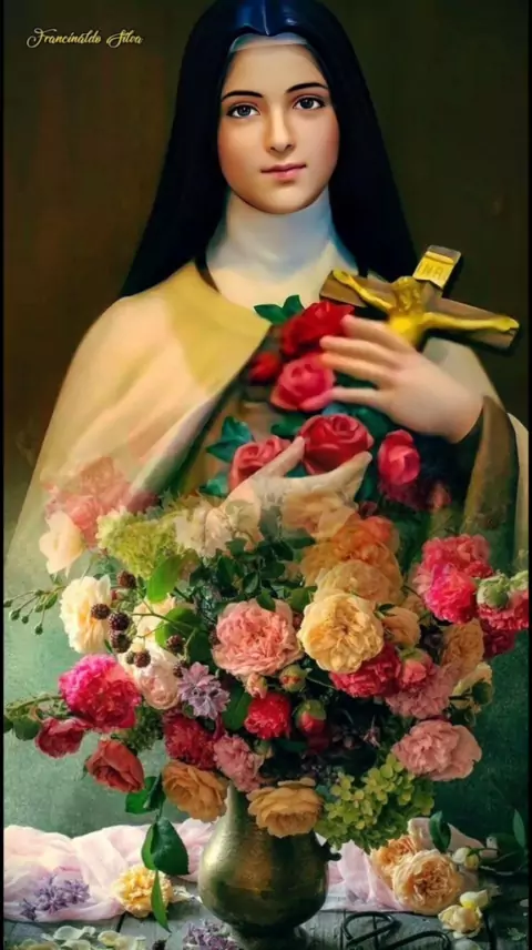 As rosas na imagem de Santa Teresinha simbolizam uma promessa que ela fez antes de morrer. Aos 24 anos de idade, em 30 de setembro de 1897, Santa Teresinha disse às irmãs: "Farei cair uma chuva de rosas sobre o mundo!" As rosas simbolizam a intercessão de Santa Teresinha por todos aqueles que a pedem em oração. #oração #santaresinha #EstrelaDeFamília #Ultra10kvis #CrescerNaFamília
