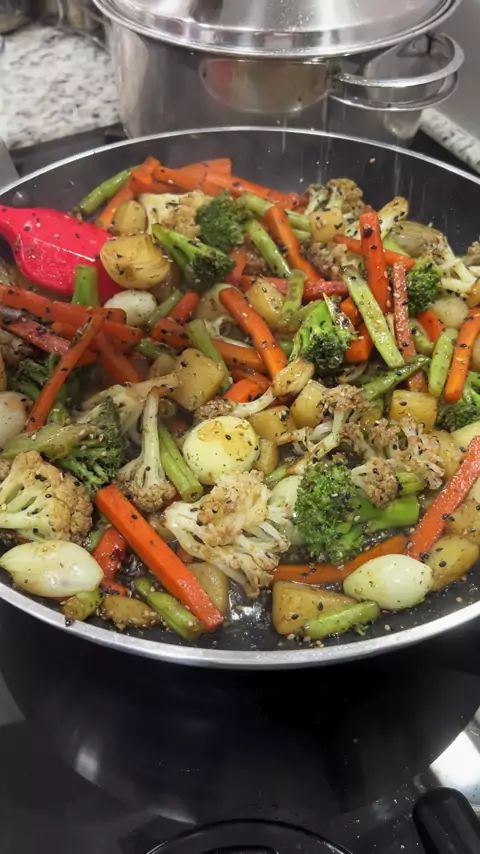 Legumes Salteados no Shoyu 01 Batata; 200 Gramas de Mini Cebolas; 250 Gramas Couve-Flor; 1/2 Maço de Brócolis; 03 Cenouras; 1/4 Repolho Roxo; 250 Gramas de Vagem; 01 Colher (sopa) Chimichurri; 01 Colher (sopa) Gergelim Preto e Branco; 05 Colheres (sopa) Azeite; 01 Colher (sopa) Açúcar Mascavo; 1/2 Maço de Salsinha; 40 ML de Shoyu; Sal a Gosto; Pimenta Caiena a Gosto; #receitas #amo #amocozinhar #deliciasdaeleni
