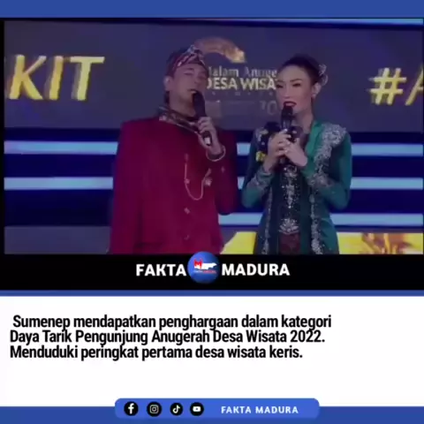 Malam Anugerah Desa Wisata Indonesia (ADWI) 2022 berhasil menobatkan Desa Wisata Keris Aengtongtong sebagai Juara 1 Kategori Daya Tarik Pengunjung. Acara tersebut telah berlangsung tadi malam/ Minggu 30 Oktober 2022 bertempat di Gedung Sapta Pesona Kemenparekraf, Jakarta disaksikan oleh Menparekraf RI dan beberapa undangan yang hadir.#orangmadura#madura#budayamadura#sumenep#