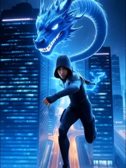 Animasi cinematic hero vs dragon dengan cahaya biru elektrik dan petir menyambar di atas metropolis. . HeroVsDragon #AIBattle #AIAnimation #CinematicCGI #Trending