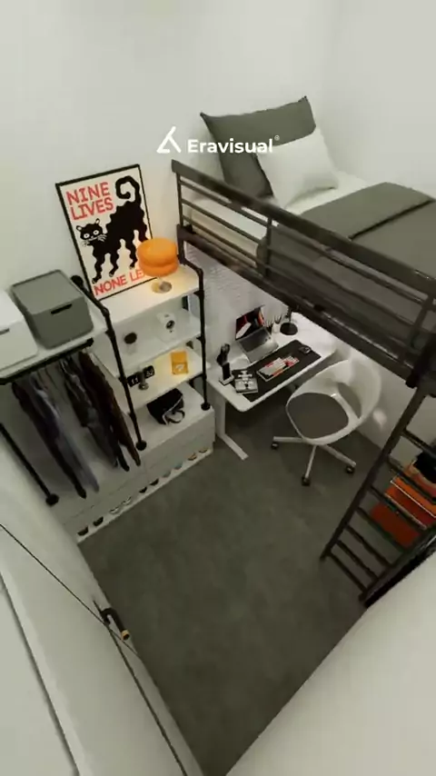 Membalas @. Kamar tidur ukuran 2 x 2.5 meter pake mezzaninnya dibikin kaya gini aja, gimana? Ini tim Eravisual pake nuansa monochrome gitu. Next, styling ruangan apa lagi yaa? #loftbed #desainkamar #kamarmezzanine #kamarmonokrom #eravisual