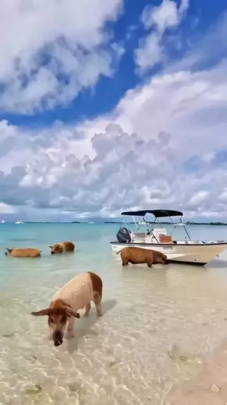 Praia do porco. 🐷🏝️ Um lugar único onde pode nadar e conviver com os locais" 🌊🚤 📍Exuma, Bahamas 🇧🇸 #Destinos #paraiso #Viagens #Travel