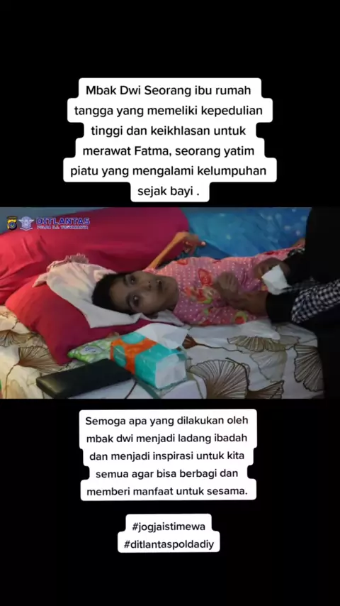 Banyak pelajaran yang saya ambil saat bersilaturahmi ke rumah Mbak Dwi Oktaviani, di Dusun Klegen, Pengasih, Kulon Progo. Mbak Dwi Seorang ibu rumah tangga yang memeliki kepedulian tinggi dan keikhlasan untuk merawat Fatma, seorang yatim piatu yang mengalami kelumpuhan sejak bayi . Semoga apa yang dilakukan oleh mbak dwi menjadi ladang ibadah dan menjadi inspirasi untuk kita semua agar bisa berbagi dan memberi manfaat untuk sesama.#jogjaistimewa#ditlantaspoldadiy