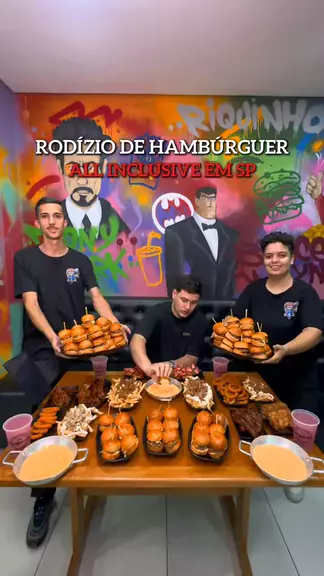 RODÍZIO DE HAMBÚRGUER ALL-INCLUSIVE EM SP 🍔🍟 Fomos até o @burguesia.sp e encontramos o rodízio de hambúrguer mais completo de São Paulo! Além dos mini burgers, por aqui tem costelinha barbecue, cheddar à vontade, chopp Brahma e até sobremesa — tudo incluso no rodízio! Confira as opções: RODÍZIO SIMPLES – inclui: • Mini lanches: Bill Gates, Tony Stark, Riquinho e Megan Fox • Frango frito • Costelinha barbecue • Batata cheddar e bacon • Batata com catupiry e costela • Onion rings • Molhos (m