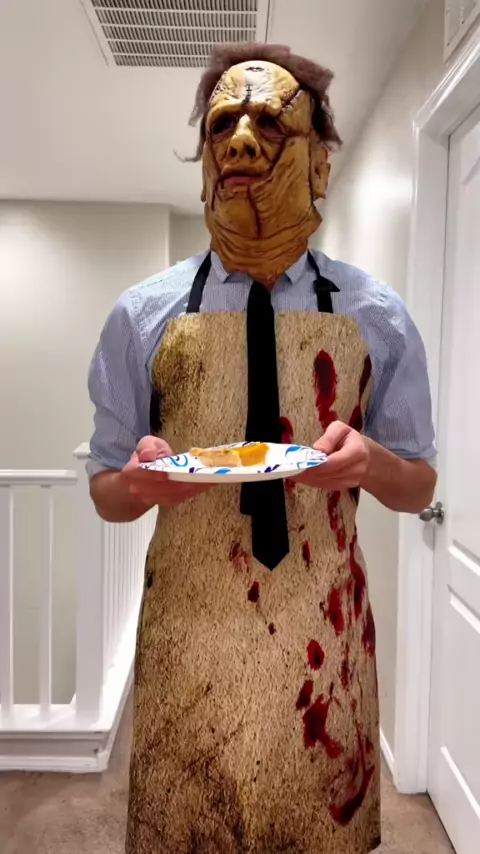 Leatherface leva o último pedaço de torta # horror # horrortok # thunderwolf # Ghostface # michaelmyers # freddykrueger # jasonvoorhees # Leatherface # Thanksgiving # pie # funny # halloween # October # November # explorepage # trend # viralvideo # # figurino # cosplayer # cosplay # badbunny