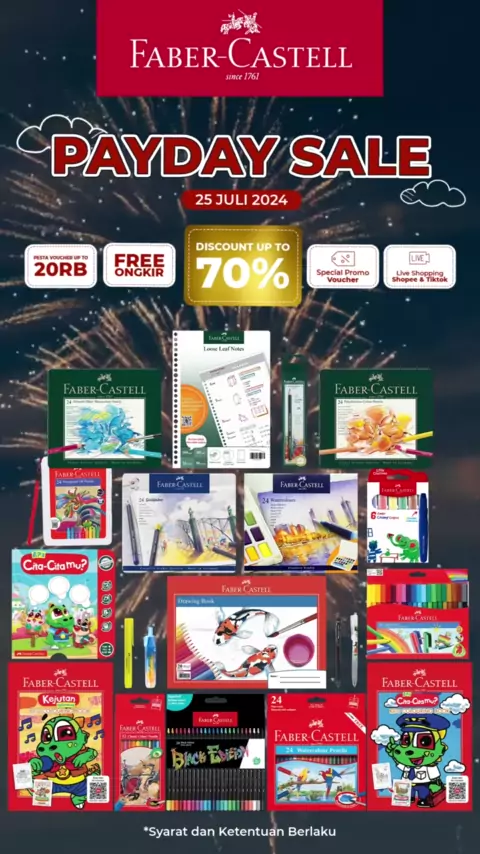 Jangan Sampai Kelewatan Payday Sale 25 Juli 2024!!! 🤩 Lengkapi koleksi alat gambar dan alat tulismu dengan diskon spesial hingga 70%, pesta voucher hingga 20 ribu, dan gratis ongkir untuk produk Faber-Castell kesayanganmu. Ikuti juga keseruan live shopping Faber-Castell untuk mendapatkan promo voucher spesial Hanya di Official Shop Faber-Castell. #FaberCastell #Art4All #FaberCastellCreative #FaberCastellKreatif #BigSale #SuperSale #Juli #BelanjaOnline #Promosi #Diskon #OnlineShop #Grati...