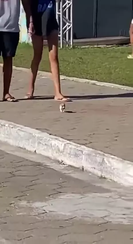 Um baby pinscher na companhia da mamãe andando pelas ruas para alegrar o seu domingo.