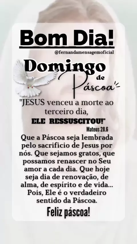 🕊️Jesus Cristo ressuscitou e vive dentro do coração de cada um de nós. Bom dia, Feliz Páscoa!🙏☀️ . . . Me siga aqui Kwai 🥰 Estou tbm no Instagram 🌼 👉 Fernanda mensagem oficial ❤️ #bomdia #domingo #pascoa #kwai