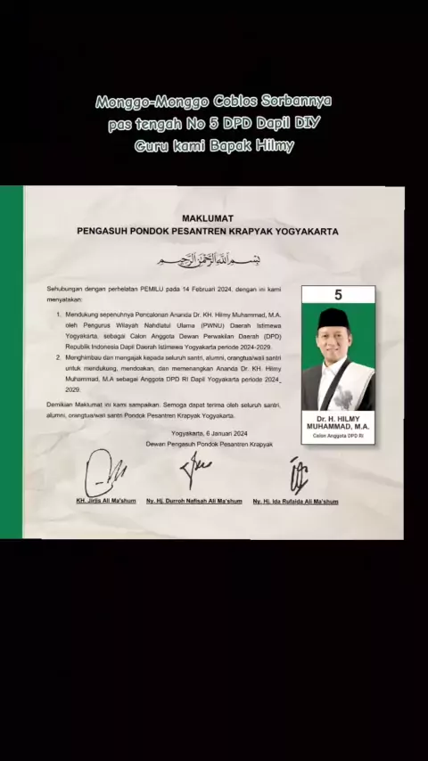 Mari kita warga Jogja dukung beliau Bapak Hilmy Muhammad sebagai DPD Dapil DIY periode 2024-2029 wakil dari PWNU Yogyakarta. InsyaAllah jujur, amanah, cerdas, terpercaya#dpddiy#dewanperwakilandaerah#dapildiy#dpdri#khhilmymuhammad#gushilmy#pwnudiy#filesantri#santrijogja