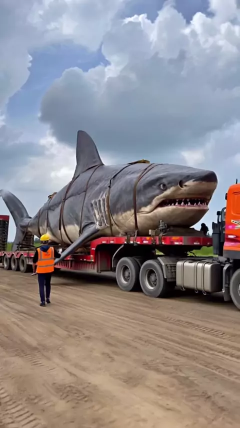 Real or CGI? Decide after watching ⬇️ 🔵 Top secret transport spotted in broad daylight 😳 That shark is WAY too real… Truck. Dirt road. A living shark. The camera didn’t blink — but the shark did. #aiwowai #megalodon #giantshark #realornot #heavyequipment