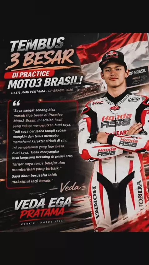 Bangga banget! 😭🇮🇩 Veda Ega Pratama berhasil finis P3 di Moto3 Brazil 2026! 🏁🔥 Dari start penuh tekanan… Sampai duel sengit di lap terakhir… Veda buktiin kalau Indonesia bisa bersaing di level dunia! 💪🌍 Ini bukan cuma podium… Ini sejarah baru buat balap Indonesia! 🇮🇩🔥 Gas terus Veda!! Next target: JUARA 1! 🏆 #VedaEgaPratama #Moto3 #MotoGP #IndonesiaBangga #PembalapIndonesia 🇮🇩🔥
