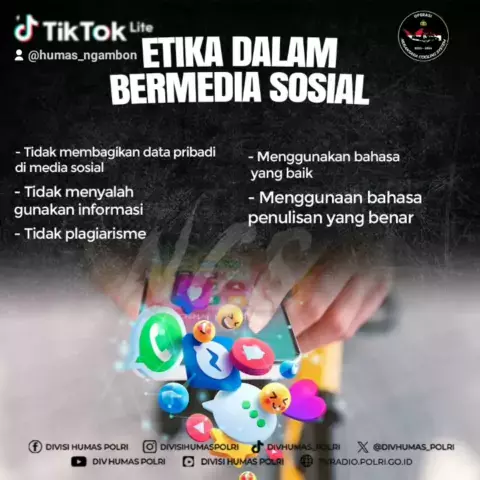 Etika Dalam Bermedia Sosial Sobat Polri, tahukah kamu dalam bermedia sosial juga punya etikanya sendiri lhoo. Yuk simak beberapa etika berikut, agar kamu tidak salah dalam bermedia sosial. Sumber : @ditjenppi.kominfo #PolriPeduliKemanusiaan #ayojogojonegoro #inovasiproblemsolving #kompetesibhabinkamtibmas #kampungbebasnarkoba polresbojonegoro