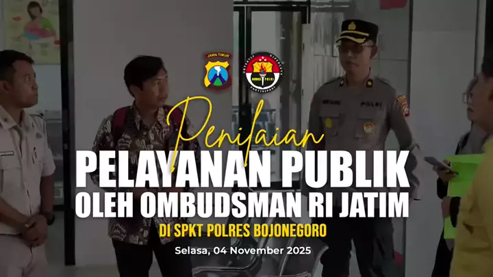 Penilaian Pelayanan Publik oleh Ombudsman RI Jatim di SPKT Polres Bojonegoro Polres Bojonegoro menerima kunjungan tim Ombudsman Republik Indonesia Perwakilan Jawa Timur melaksanakan kegiatan penilaian maladministrasi penyelenggaraan pelayanan publik di Sentra Pelayanan Kepolisian Terpadu (SPKT) Polres Bojonegoro. Kegiatan ini dilakukan sebagai bagian dari evaluasi tingkat kepatuhan instansi terhadap standar pelayanan publik, Selasa (4/11/2025). Polres Bojonegoro berkomitmen untuk terus menghad...