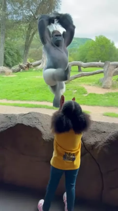 This little girl started a dance-off with a gorilla and he understood the assignment! 🤣 Wait for his move! 🦍💃 #gorilla #danceoff #zoo # #viral #funnyanimals #silverback #cute #animalsof #wholesome #zoolife ゚viral🖤