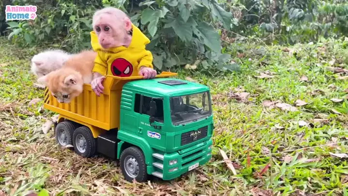 Bayi monyet mengendarai truk dan menarik kucing untuk memetik buah-buahan. Monyet itu sangat sibuk.