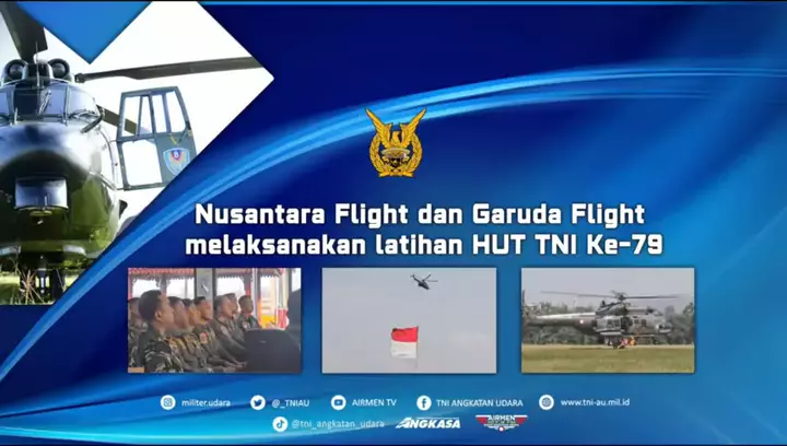 π "Nusantara Flight dan Garuda Flight melaksanakan latihan HUT TNI Ke-79" Nusantara Flight dipimpin oleh Leader Commander Skadron Udara 8 Letkol Pnb Adam Hardiman Ali, M.Han. Dengan diikuti oleh pesawat panther TNI AL, pesawat NAS-332 Super Puma dan pesawat MI-17 TNI AD. Sementara itu, Garuda Flight memperlihatkan formasi helikopter yang megah dipimpin oleh Mayor Pnb Resque Pambudi, S.M. MPMDS melintasi Monumen Nasional (Monas) dengan gagah. "TNI Angkatan Udara - Jauh di Langit Dekat di Hati" ...