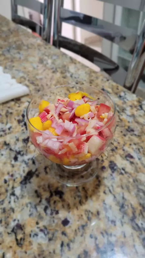 Testando mais uma receita.... Ceviche de Kani com manga!! Diz aí... Qual receita devo testar agora??