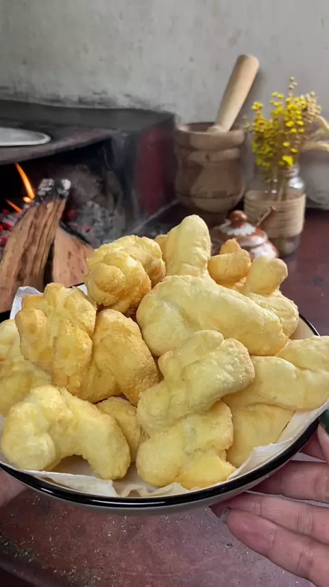 Biscoito frito 500 gramas de polvilho azedo 100ml de óleo 100ml de água 1/2 colher sopa de sal Usei 5 ovos ( porém eram pequenos, coloque aos poucos ate dar ponto)