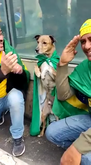 "Cão bolsonarista" viraliza nas redes sociais. Vídeo mostra cachorro prestando continência ao lado de manifestantes.