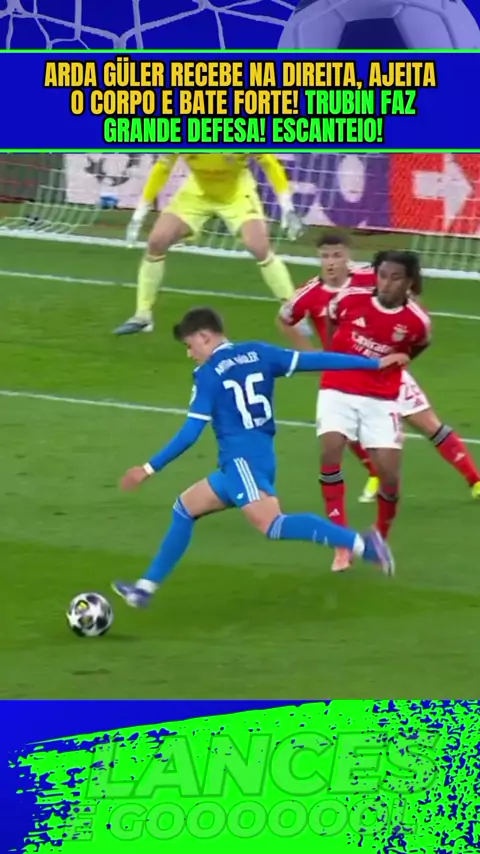 Arda Güler recebe na direita, ajeita o corpo e bate forte! Trubin faz grande defesa! Escanteio!#championsleague #BenficaxRealmadrid #Realmadrid #Benfica #Esporte More