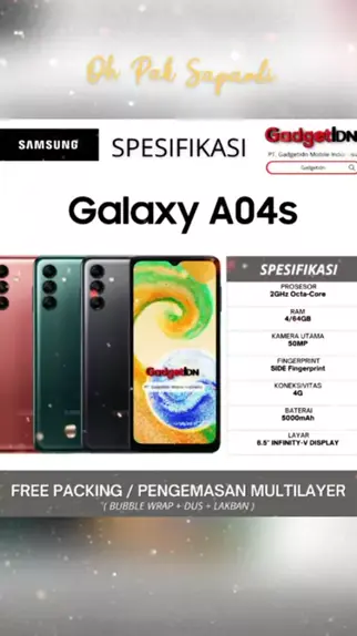 #samsunA04s$ - Processor : Exynos 850 - Size : 6.5" - Technology : PLS LCD, 90 Hz - Resolution : Inviity-V Display - Rear Camera Resolution : 50 MP + 2 MP + 2 MP - Main Camera Auto Focus : Yes - Rear Camera - OIS : No - Rear Camera - Zoom : Digital Zoom up to 10x - Front Camera Resolution : 5.0 MP - Front Camera Auto Focus : Yes - Video Resolution : FHD (1920 x 1080) @30fps - RAM : 4GB - ROM : 64GB - SIM Tray : Dual-SIM - Network Type :4G - USB Interface : USB Type-C - USB Version : USB 2.0