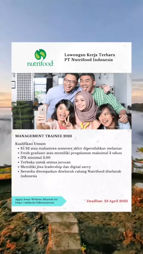 Lowongan Kerja PT Nutrifood Indonesia MANAGEMENT TRAINEE 2023 Kualifikasi Umum : S1/S2 atau mahasiswa semester akhir dipersilahkan melamar Fresh graduate atau memiliki pengalaman maksimal 3 tahun IPK minimal 3,00 Terbuka untuk semua jurusan Memiliki jiwa leadership dan digital savvy Bersedia ditempatkan diseluruh cabang Nutrifood diseluruh Indonesia Info Selengkapnya : https://bit.ly/lokersatucom Deadline: 23 April 2023#loker#lowongankerja#lokersatucom#lokerjakarta#