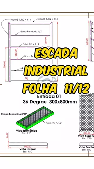 Folha 11/12 - Escadas Industrial. Detalhe corrimão e degrau. Solidworks Project. #NR12 #escadaindustrial #escada #solidworks #solidworksbrasil