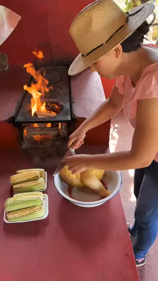 Frango caipira com milho verde feito no fogão a lenha!